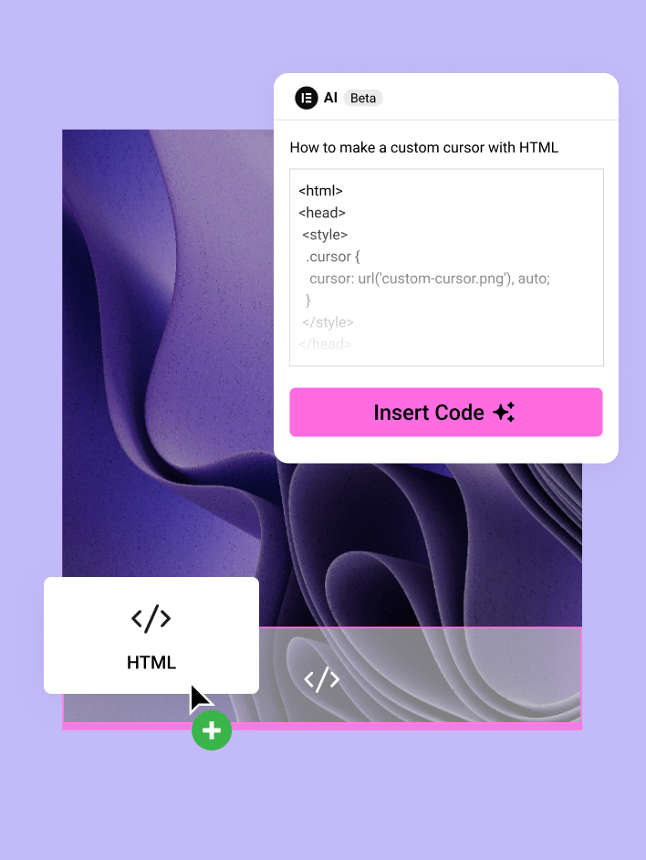Laat je website opvallen met effecten en functies met behulp van de AI-codeassistent van Elementor. Voeg CSS, code, JavaScript of HTML toe aan je website zonder zelf een regel code te hoeven schrijven.