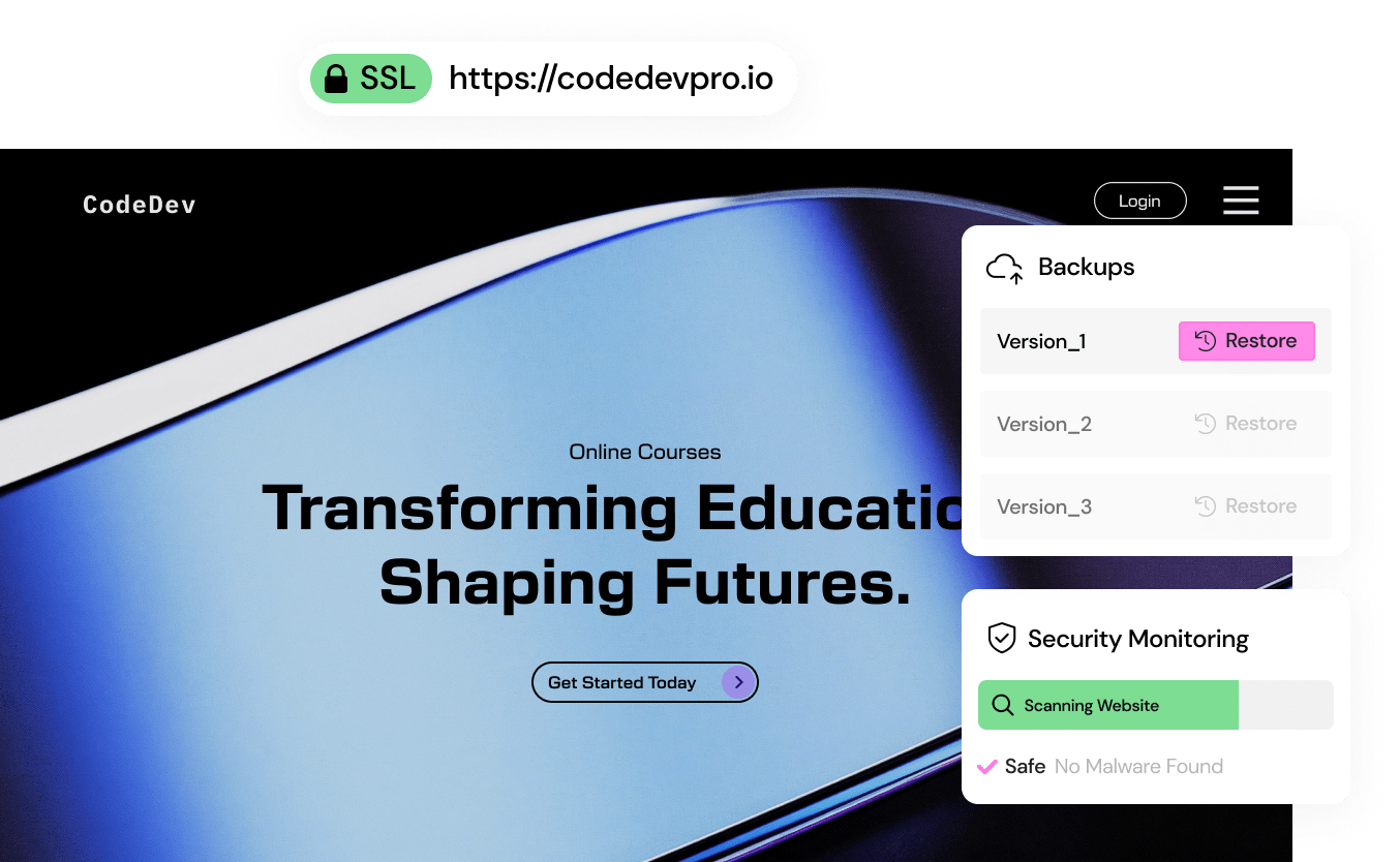 Met Elementor hosting krijgen je websites beveiliging op bedrijfsniveau die wordt bewaakt door cyberexperts om een soepele, veilige en zekere online ervaring voor jou en je websitebezoekers te garanderen.